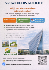 Het Wijkplatform Morgenstond is een bewonersorganisatie, voor en door bewoners. We zetten ons in voor het algemeen wijkbelang en organiseren activiteiten die de samenhang in de buurt versterken en het leef- en woonklimaat verbeteren.